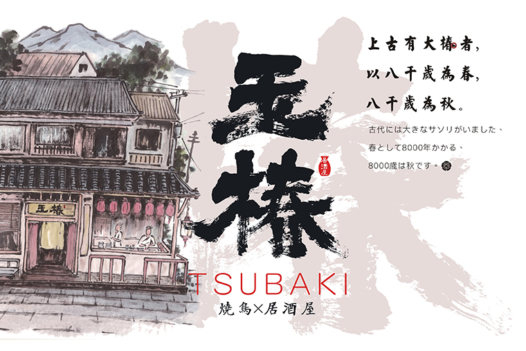 我們希望透過這個書法文字的LOGO標識及輔助的家徽圖案塑造玉椿經典的日式美學氣質和料理文化底蘊。表達品牌傳承百年,初心如一的愿景,使之成為指引玉椿品牌前進的燈塔。玉椿燒鳥居酒屋,將“百年老店”的美好愿景可視化,為顧客所信賴。